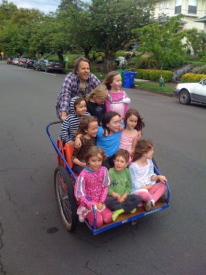 Vi também uma bicicleta de um surfista com umas aplicações para levar a prancha, e eis mais uma família a pedalar....