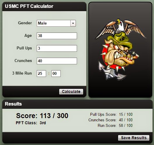 #12 - Fiz o teste de fitness dos Marines! Elevações, abdominais e corrida. consegui uma pontuação miserável: 113 em 300! É para melhorar...a ver se o faço o teste mensalmente.